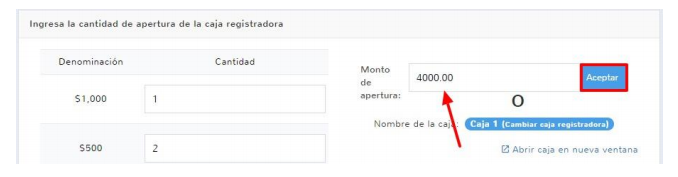 2. Nos aparece una interfaz para hacer el ingreso de las monedas y billetes de caja las cuales ingresaremos o ponemos poner solamente la moto total, una vez ingresado damos en Aceptar.