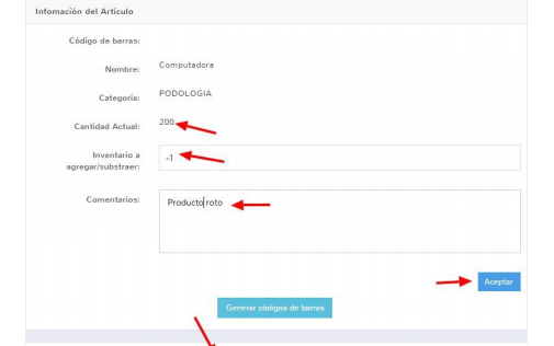 1. Editamos el producto y colocamos la cantidad deseada con numeración positiva para agregar y negativa para quitar del inventario, tenemos que hacerlo en la sucursal que haremos el cambio.